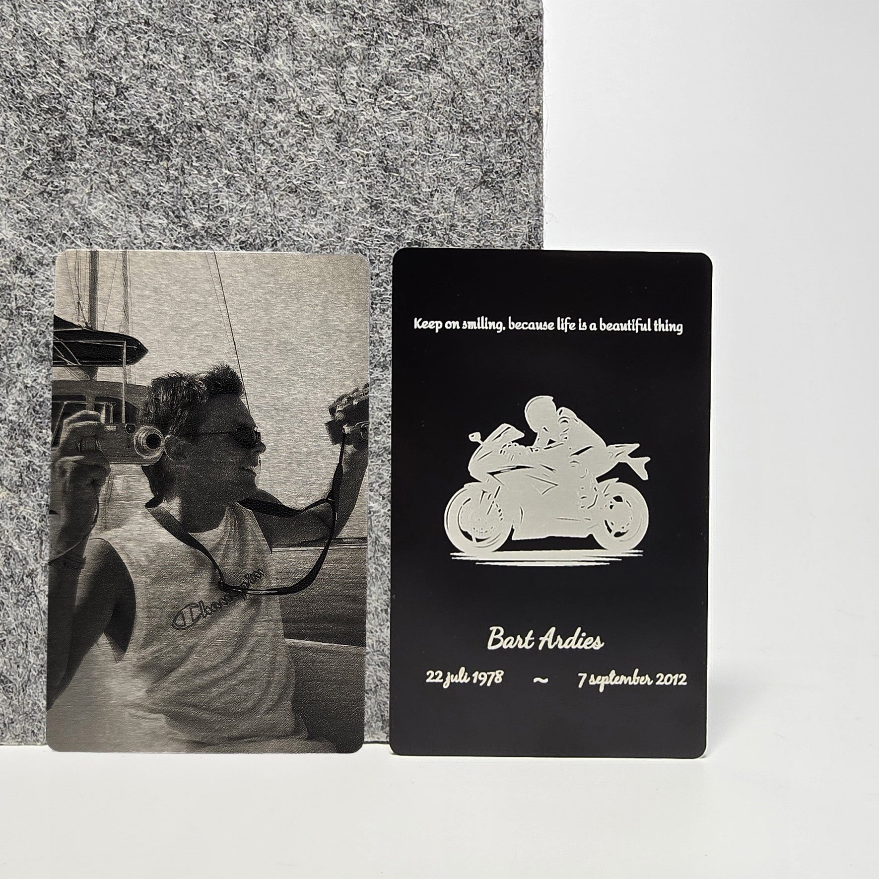 Dit Foto-gegraveerd metalen kaartje is volledig personaliseerbaar